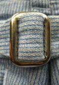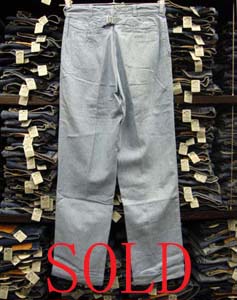特徴:デニムとシャンブレーの間の厚さのコットン地に水色と青のストライププリントのお洒落パンツでZIPPERはU.S.A.GRIPPERでバックストラップバックルが付き裾はダブル仕立てです。 .