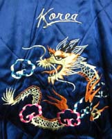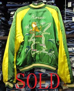特徴:明るい黄緑xイエローボディーにフロント両胸がトラで背中がKorea地図で裏面が青xシルバーサテンボディーにKorea龍の派手な配色のスカジャンでDEAD STOCKを数回着用した未洗いNO WASHです。