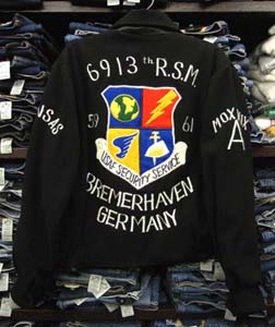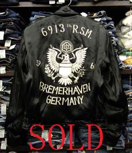 特徴:1951年にヨーロッパのBREMERHAVEN(ブレーマーハーフェン)に設立された6913th R.S.M.アメリカ空軍(U.S.A.F)に1959年から1961年まで駐在していたKANSAS州出身のBillがオーダーした黒サテンx黒ウールのリバーシブルで表も裏も豪快に刺繍が入った大人も着れるカッコいいミリタリースカジャンでサテンの方の右ポケットのMADE BY LACHMANN/GERMANYのタグがまだパリっとしてボディーもあまり着用感のないまだ水の通っていないNO WASHです。