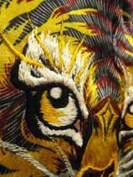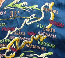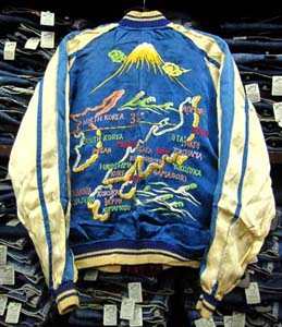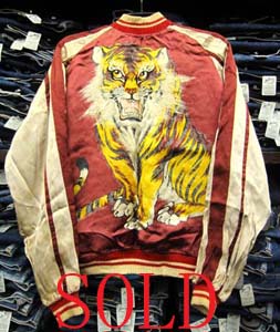 特徴:背中一面に大きく迫力のあるトラが顔だけではなく全身プリントされた上からタテガミ・ひげ・眉・牙・鋭い目などが丁寧に刺繍されたスカジャンの中でも希少価値があり人気のある一面とフジヤマとアメリカ兵が当時在中していた基地が日本地図(ほとんどのスカジャンに北海道も描かれていますがこちらは北海道にアメリカ基地がないことから北海道が描かれていない珍しいパターン)と第二次世界大戦末期に朝鮮半島を横切るアメリカ軍とソ連軍の分割占領ライン北緯38度線が刺繍された裏返して着ると違った雰囲気のスーパースペシャルSOUVENIRスカジャンです。