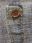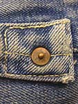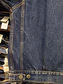 特徴:濃い中にもアタリのでた革パッチの時代のXX地が使われているLEVI'SセカンドデニムJKTでポケットのフラップ裏はデニムよりもオンスの軽いデニムシャツ地でボタン裏は無刻印で背中の両サイドはサイズが42以上のモノにみられ追加生地があるタイプで全体のステッチは人気のあるオレンジxイエローの2色使いです。