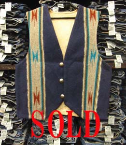 特徴:デニムなどに合わせやすい紺ベースのネイティブ柄でチマヨ地方で手織りされたベストでコンチョは1913年から1938年まで製造されていた表がインディアンの横顔で裏がバッファローのFIVECENTで上2個が1934年で1番下が1936年製で裏地はこの年代に見られる多少厚みのある柄の入ったサテン地です。