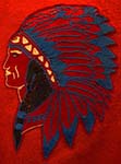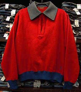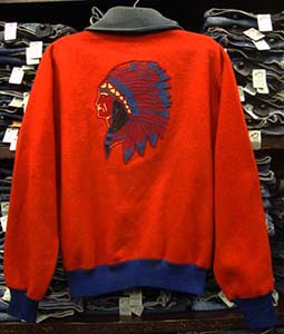 特徴:赤のウール地に紺のリブの配色のバランスのいい2トーンカラーで背中には大きくインディアンの横顔のチェーンステッチのフエルトが縫われた襟付きのプルオーバースウェットシャツです。