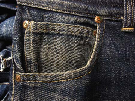 豪快に色落ちする右綾(正面から見たときに右上がりに走っているデニム地でソフトな色落ちの左綾に比べて豪快に色落ちする )