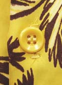 特徴:ヴィンテージデニムパンツとの相性のいい茶色ベースのMADE IN HAWAII(ハワイでデザインされてハワイで作られた)レーヨン素材でハワイメイドらしい鮮やかな南国のHAWAIIで見かける植物柄の品のある配色の人気のあるボーダー柄で襟はこの年代らしい先のとがったデザインでボタンは天然のココナッツシェル(ヤシの実の皮)です。