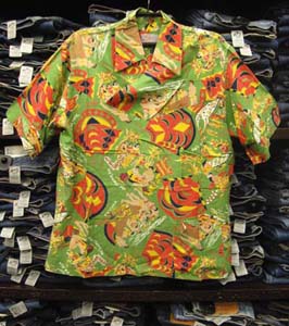 特徴:ハワイアンシャツの中でも人気のあるメーカーのKAMEHAMEHA製で更に人気のある1930年代〜1960年代に活躍したアーティスト ユージーンサヴェージのメニュー柄(1900年代から1969年まで サンフランシスコ〜ハワイ間を就航していたハワイ航路の豪華客船マトソンラインの船内レストランのメニューにかかれたデザイン)でミミにOriginal matson menu design by eugene savageの文字入りでこちらはレーヨンではなくコットン製です。