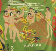 特徴:ハワイアンシャツの黄金期1940年代に活躍したハワイアンシャツのデザイナー ジョン・ケオニ・メグス作のカメハメハ大王が着ていた黄金のマントとハワイアンレイをした男の人達が縄網で漁をしている上手な絵でフロントはボタンではなく被りでポケットが裾の方に付くタイプのお洒落者だとカッコよく着こなせる作りのヴィンテージレーヨンハワイアンシャツです。
