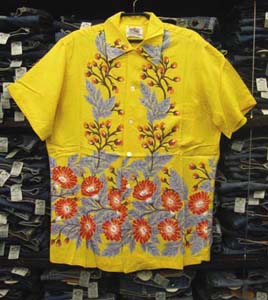 特徴:ベージュのギャバ地にハワイの人と花柄プリントが切り替えになったお洒落なレーヨンシャツで襟はこの年代の特徴のひとつでもあるロングポイントのnew yorker製シャツです。