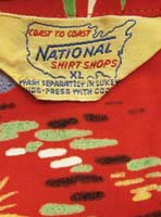 特徴:40年代のロングポイント襟に比べると若干スクエアな襟の50年代製の紺ベースでフロント中心が巻貝のボーダーで全体に熱帯魚がプカプカ泳いでいる涼しげなデザインのMADE IN U.S.A.(アメリカでデザインされアメリカで作られた)ARROW製RAYONハワイアンシャツです。