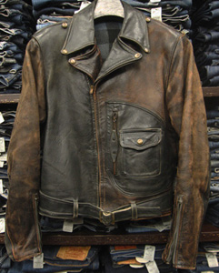 特徴:カッコよくアタリじわがでたSTEER HIDE(雄牛の皮:長い年月を経て着込まれると質感がHORSE HIDE馬革とあまりちがいがない)で所どころにスタッツが付きフロントに人気のあるDポケが付いたライダースレザーJKTです。