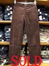 特徴:こげ茶とタイガーイエローの細かく混じり合ったコーディロイパンツです。HOLLYWOOD映画の衣裳会社AMERICAN COSTUMEのスタンプが付いているので何かのハリウッド映画に使用されたパンツです。フロントトップは茶色のボタンでZIPPERはSERVALです。