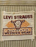 特徴:LeeのWESTERNERシャツと共に人気のある光沢のないオフホワイトサテン地に四角の枠に四角の石が入った角(かく)スナップボタンのWrangler BLUE BELL刺繍タグシャツで胸ポケットにはWのステッチが入っています。