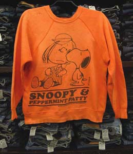 特徴:ヴィンテージスヌーピーのスウェットシャツでお馴染みのMADE IN U.S.A.SPRUCE製でチャーリーブラウンに片思い中で何事も恐れない生まれついてのリーダーでそばかすがチャームポイントのペパーミント パティとスヌーピーのシミ込みプリントでレプリカのようにパキッとしたオレンジではなく経年変化で多少退色したヴィンテージの“E”や“66”の501との相性のいいカッコいいオレンジ色の両面プリントスウエットシャツです。