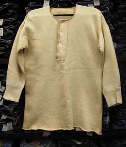 特徴:1930年代に肌着として着られていた厚みのある裏が起毛になったベージュのヘンリーネックのハーフボタンで前立ての裏地はガーゼになっていて所どころ太めの4本糸で縫われているのも当時の特徴で501XXやLeeの赤タグなどスタイリッシュに見えるパンツではなく古い時代のペインターやオーバーオールなどワークモノとの相性のいいスウエットシャツです。