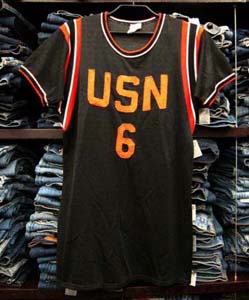 特徴:Cotton66%Nylon34%のあまり伸縮性のないジャージ地のような黒ベースにオレンジの古いフエルトが縫い付けられたU.S.NAVYスポーツチームのTシャツです。