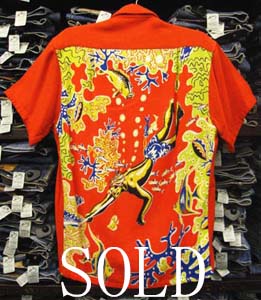 特徴:HOLLYWOOD STYLED CAMPUS製の多少厚みのあるレーヨン地に背中に大きくプリントされた迫力のあるカッコいいバックパネルでフロントは下の方にポケットが2個付いた大人っぽいお洒落なのヴィンテージハワイアンシャツす。