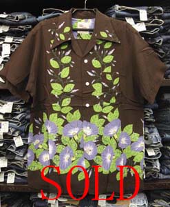 特徴:当時の日本では考えつかない深い品のある茶色に色鮮やかなうす紫いろの朝顔に色鮮やかなミントグリーン色の葉のハワイアンシャツとしてはめずらしい柄で水平に豪華に広がったフラワー柄ホリゾンタルのレーヨン素材ハワイアンシャツでカメハメハと並ぶ有名ハワイアンメーカーKAHANAMOKU(カハナモク)の正方形の初期型タグで大人が着れるスペシャルなヴィンテージハワイアンシャツです。