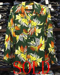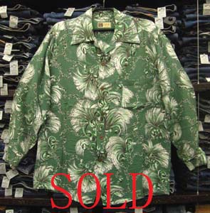 特徴:深い品のある緑色ベースに南国らしい熱帯植物とHAWAIIANガールが描かれた有名ハワイアンメーカーDUKE KAHANAMOKU製のロングスリーブで大人が着てカッコがつくヴィンテージハワイアンシャツです。