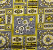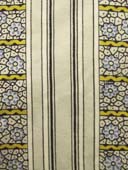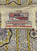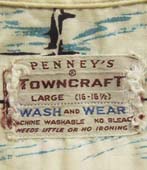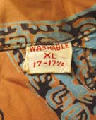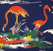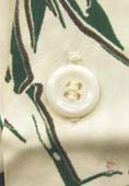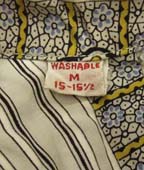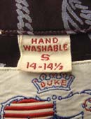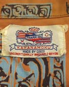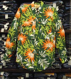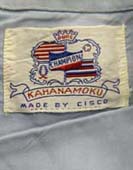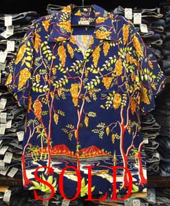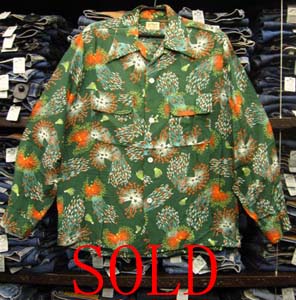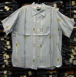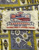 特徴:ハワイアンシャツらしいバックパネルやメニュー柄やホリゾンタル柄やピクチャープリントやフラワー柄などではなくフィフテーズのシャツよりの柄も当時作っていたKAMEHAMEHA製の花をモチーフにした細かい柄のボーダーで1949年にニューヨークのシスコ社に移行されたMADE BY CISCOの文字がタグに入り襟は40年代のロングポイントに比べると多少スクエアな50年代のレーヨン素材で配色のバランスがお洒落なシャツです。