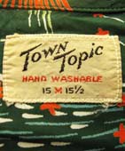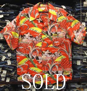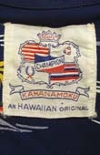 特徴:この時代にホップサックのバックパネルなどわりとカッコいいハワイアンシャツを作っていた事でも有名なmade in CALIFORNIA製で人気のあるBLACKベースのレーヨンにダイヤモンドヘッドをバックにサーフィンを楽しむ人やフラダンスを踊る人やボートをこぐ人などがパイナップルの中に描かれてALOHA HAWAIIの文字が花文字の全体がセンスある柄のレーヨンハワイアンシャツです。