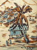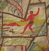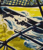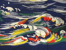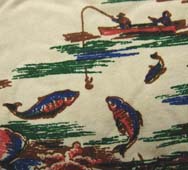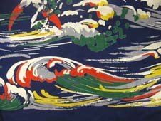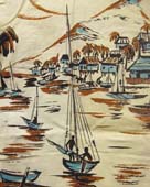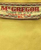 特徴:40年代から50年代のCatalina製などにもみられる多少厚手のレーヨン地にキャンパスのようにハワイの人達の日常がデザイン性が高く上手なタッチで描かれている初めて見た人が多いであろうスペシャルな柄のMADE IN U.S.A.McGREGORの品のあるヴィンテージハワイアンシャツです。