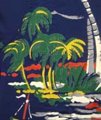 特徴:すじすじした織りが入った紺ベースにヤシの木やヨットやハワイの藁ぶき小屋などHAWAIIの風景がプリントされたTroy of California製のロングスリーブレーヨンハワイアンシャツです。