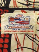 特徴:深く濃いボルドー色ベースに白とグレーでグラデーションカラーで描かれた楓の和柄ロングスリーブレーヨンハワイアンシャツででハワイアンシャツでお馴染みのKAHANAMOKU社製で前身頃の裏のミミには1949年にニューヨークのシスコ社に移行されたa Cisco Casuala Duke Kahanamoku Purintの文字が入っています。