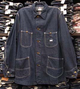 特徴:流行りの濃い色をしたアタリの出にくいJELT DENIM地のLee91−Jのデニムカバーオールでフロントのボタンは首振りタイプです。