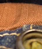 特徴:チンスト付きのデニムJ/Kでボタンは隠しボタンになった黒ラッカーのドーナツボタンです。サイドは柄の入ったバックル付きで長めのストラップが付いています。