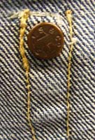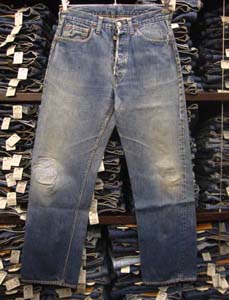 特徴:膝下のアタリの少ない場所は真っ紺の濃い色が残り上の部分にはアタリのでた革ラベル501XXのシルエットのZIPPERタイプデニムパンツです。トップボタン裏は点々点でZIPPERはGRIPPERの片爪です。