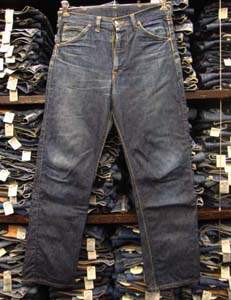 特徴:LEVI'Sと同じ右綾(正面から見たときに右上がりに走っているデニム地)でソフトな色落ちの左綾に比べて豪快に色落ちすることでも知られているLee COWBOYのデニムパンツでトップボタンはCOWBOYの文字入りドーナツで赤タグはeが斜めの転がり“e”で両ミミ(青ミミ)でヒップポケットの黒タブは付く前の時代の物です。