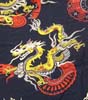特徴:紺ベースに頭が白で体が黄色い龍と頭と体が黄色い龍と頭が黄色で体がグレーの龍のロングスリーブレーヨンヴィンテージハワイアンシャツです。