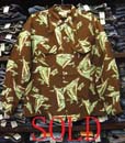 特徴:ヴィンテージデニムパンツとの相性のいい茶色ベースのMADE IN HAWAII(ハワイでデザインされてハワイで作られた)レーヨン素材でハワイメイドらしい鮮やかな南国のHAWAIIで見かける植物柄の品のある配色の人気のあるボーダー柄で襟はこの年代らしい先のとがったデザインでボタンは天然のココナッツシェル(ヤシの実の皮)です。