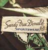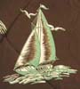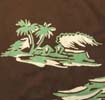 特徴:ハワイアンシャツではめずらしい茶色ベースのロングスリーブに配色のバランスのいい緑と白のヨットと海に浮かぶ南国の島のプリントのSandy mac Donald製で襟はこの年代の特徴の一つでもあるロングポイントです。