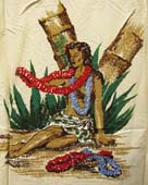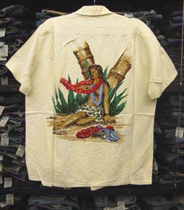 特徴:バックパネルでもお馴染みのArtvogue社製のオフホワイトベースに背中一面に大きくハワイアンフラワーレイを掛けた女の人が座っている人気のプリントのレーヨンハワイアンシャツです。
