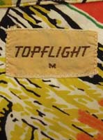 特徴:オフホワイトベースにハワイの風景がポストカード(絵葉書)のように描かれた南国らしい鮮やかな配色のTOPFLIGFT製ヴィンテージレーヨンハワイアンシャツです。