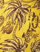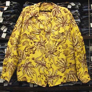 特徴:配色のバランスがお洒落なライトイエローベースに濃い目の茶色のCALIFORNIAのAlexander of Hollywood製で全面に南国らしいパームツリーやパイナップルがプリントされたロングスリーブのレーヨンハワイアンシャツです。