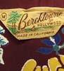 特徴:MADE IN CALIFORNIAの大人っぽいバーガンディーカラーベースに黄色いフラワープリントのBercktowne OF HOLLYWOODのロングスリーブヴィンテージレーヨンHAWAIIANシャツで襟はこの年代の特徴の一つでもあるロングポイントです。