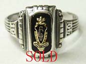 特徴:フロントが黒い石にアンカーマークとUSNの文字が張り付けてあり両サイドにはUSの文字のヴィンテージシルバーリングです。