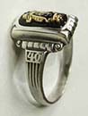 特徴:シルバーベースでフロントにフリーメーソンのコンパスと定規がデザインされ両サイドには10金GOLDのハンマーのようなデザインの入ったリングです。