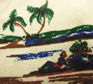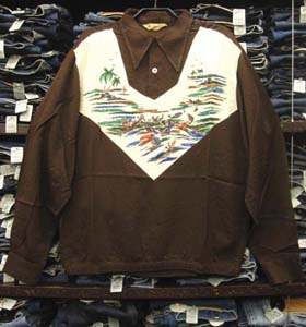 特徴:お洒落上級者だとカッコよく着こなすことができる深いブラウンカラーベースにオフホワイトの切り替えでヤシの木や碇や貝やフィッシングする人や魚など南国のプリントが入ったMADE IN CALIFORNIA elmonico製のギャバ地シャツで襟にはハンドステッチが入っています。