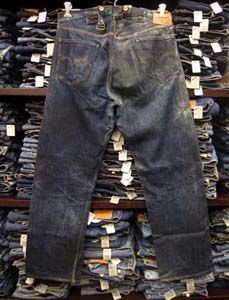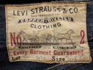特徴:201のベルト・ループなしタイプ(まだベルトループの付かない時代のモノです)でサスペンダーボタン付きのバックルバックで股リベ付きのムキ出しリベットで布ラベル付きです。1902年モデルの為サイズ表記とLOTナンバーが布ラベルの脇ではなく通常の位置に表記されています。世界でも数本しか存在しない貴重で価値のある一品です。