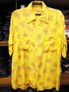 特徴:黄色ベースの茶色と白のヤシの木の柄のレーヨンハワイアンシャツです。