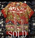 特徴:赤ベースX紫・黄色・白の鮮やかな色のプリントのレーヨンHAWAIIAN SHIRTで縄網や槍を持った躍動感あふれる当時のハワイアン漁師が描かれています。ココナッツボタン。