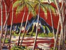 特徴:MADE IN HAWAII ハワイで作られたHole Hawaii製の赤ベースにダイヤモンドヘッドとヤシの木と大きなサトウキビの木が上手なタッチで描かれた着ていてカッコよく目立つヴィンテージレーヨンハワイアンシャツでボタンはハワイものらしいココナッツです。