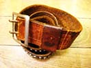 特徴:茶色の皮に金属のスタッツと赤・緑・青の石のバランスのいいカッコイイベルトです。