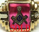 特徴:立体感のあるカッコいいデザインでしやすいサイズにサイズ直しされていて刻印は消えていますが10Kゴールドベースの質感でフロントが赤い石にフリーメイソンのシンボルでもあるコンパスと定規が立体的に張り付けられた品のあるヴィンテージフリーメイソンリングです。