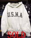 特徴:2枚仕立てのオートミールベースでリブが霜降りの後付けパーカーのランナーズタグです。フロントにはU.S.N.A(United States Naval Academyアメリカ海軍士官学校)のしみ込みプリント入りでポケットには中央からステッチが入っています。
