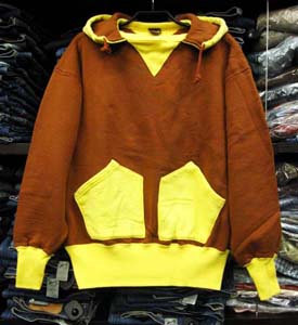 特徴:ヴィンテージの良いところを凝縮しつつそのままコピーするのでは面白みがないのであえてヴィンテージでは存在しない配色にした茶ベースに黄色の2トーンカラーの両V後付けパーカーです。ポケットは人気のあるセパレート変形ポケットで針抜きリブのリブ長です。