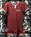 特徴:MADE IN U.S.A 100%COTTONのバーガンディー色に白のリンガーでフロント中心に白の縦ラインが付き左胸にはExeterの白のフロッキープリントが入ったチャンピオンバータグTシャツです。